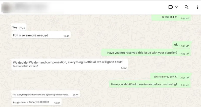 Жақында біз тұтынушы бәсекелестен Тарпаулин тәртібімен күрделі проблемаларға тап болғанын білдік. Олар арзан бағамен, ал зауытта өндірісті аяқтауға екі ай уақыт кетті. Жеткізілгеннен кейін олар өнімнің өзінде келісілген мөлшерде жоқ екенін анықтады. Тапсырыс беруші қазіргі уақытта сот ісін қарастыруда. Төменде менің осы тұтынушымен байланысымның транскрипті болып табылады.